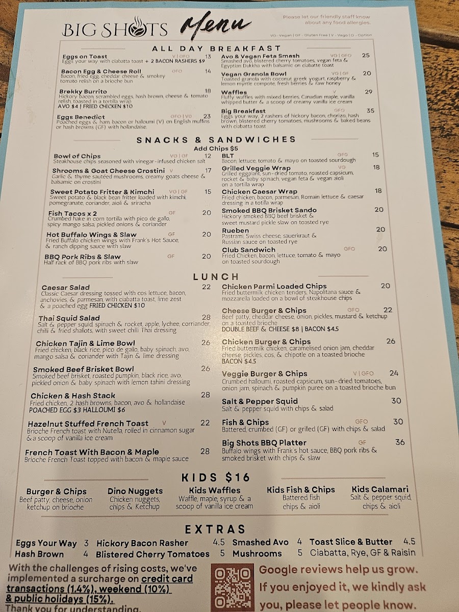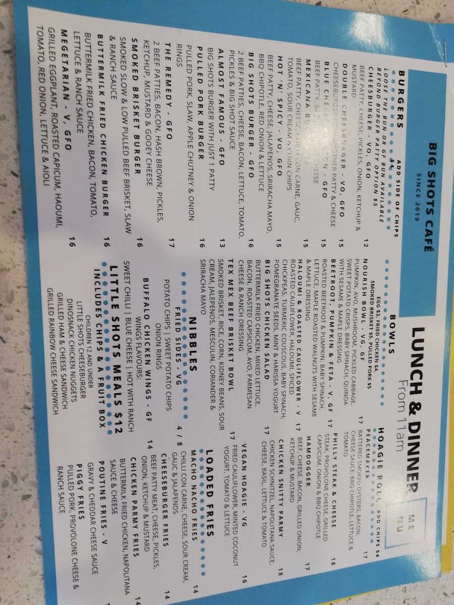 Kids are also well taken care of, with fun options like the Kids' Cheeseburger & Chips (GFO) or the playful Dino Snack Nuggets & Chips. With so many options for all ages and preferences, Big Shots Cafe provides a well-rounded menu that guarantees satisfaction with every visit.