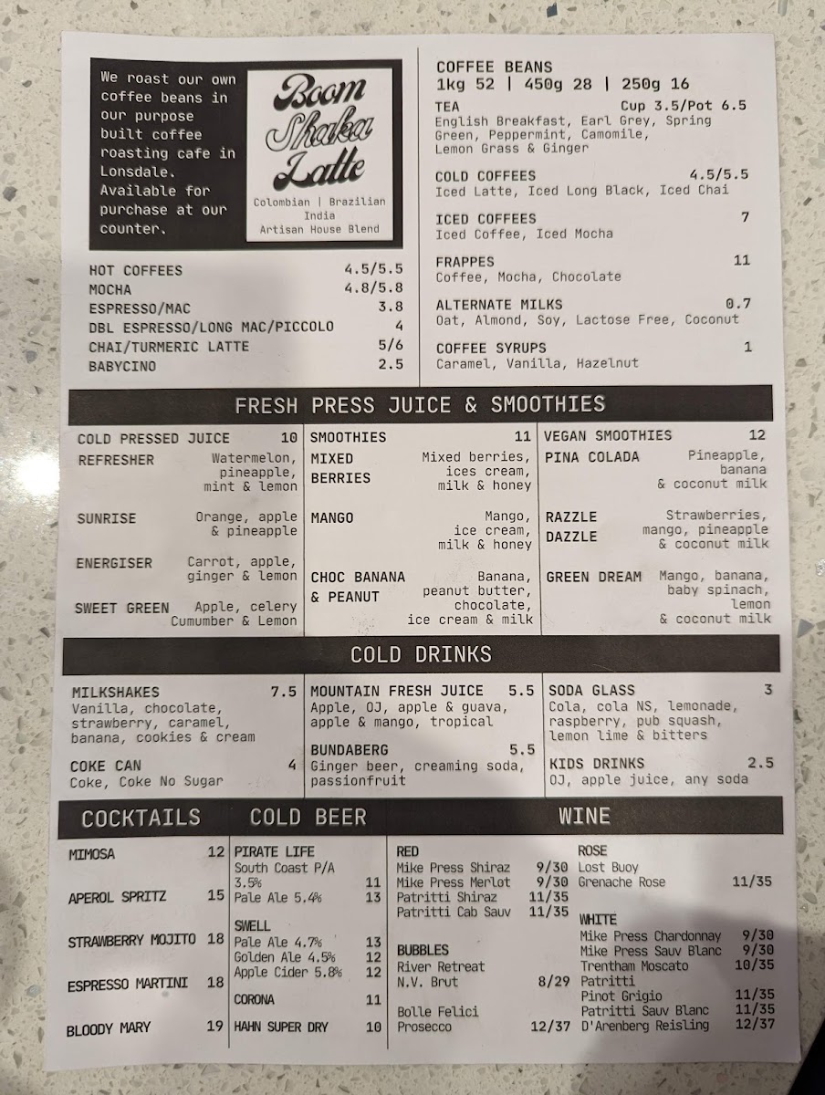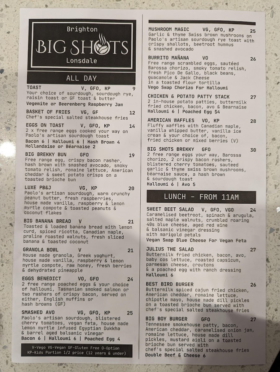At Big Shots Cafe in Brighton, the menu offers a diverse selection of beverages and meals that cater to various tastes, perfect for a casual day out or a satisfying meal. Their coffee selection is a real treat, with options like Mocha, Dirty Chai, and Latte, as well as Single Espresso and Short Macchiato for those who prefer something stronger. For something refreshing, the Can of Coke (or Coke No Sugar) and Bundaberg are great options, alongside smoothies such as Mango, Choc Banana & Peanut, and Mixed Berry.